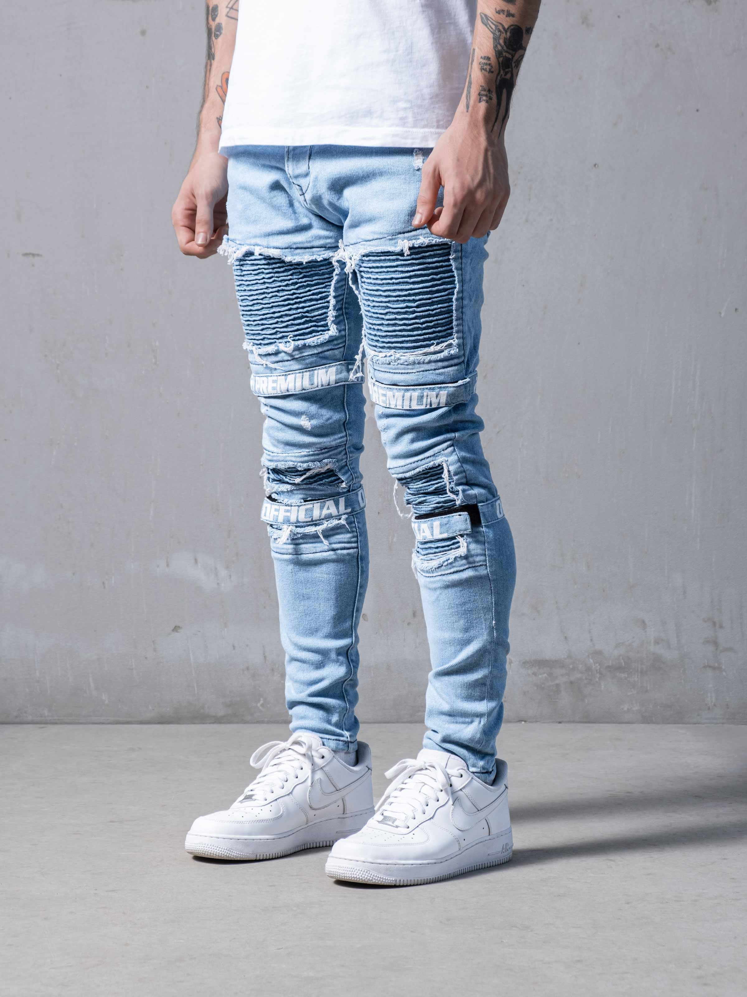 2Y Premium Blue Jeans are made from modified stretchy black denim fabric. It has rips, and they are also repaired; there are two printed hooks and piles for each leg. These Jeans are Super Skinny.
