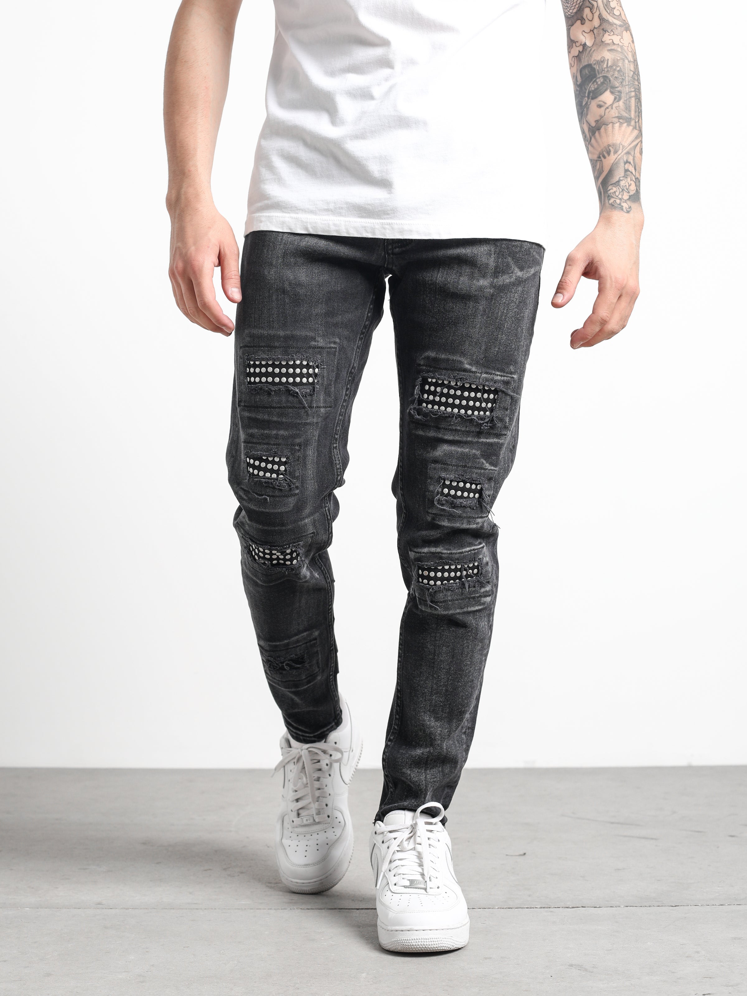 Rider Jeans are patched with pins in rip holes. It is slim-fit black jeans with light-washed stretchy denim fabric.