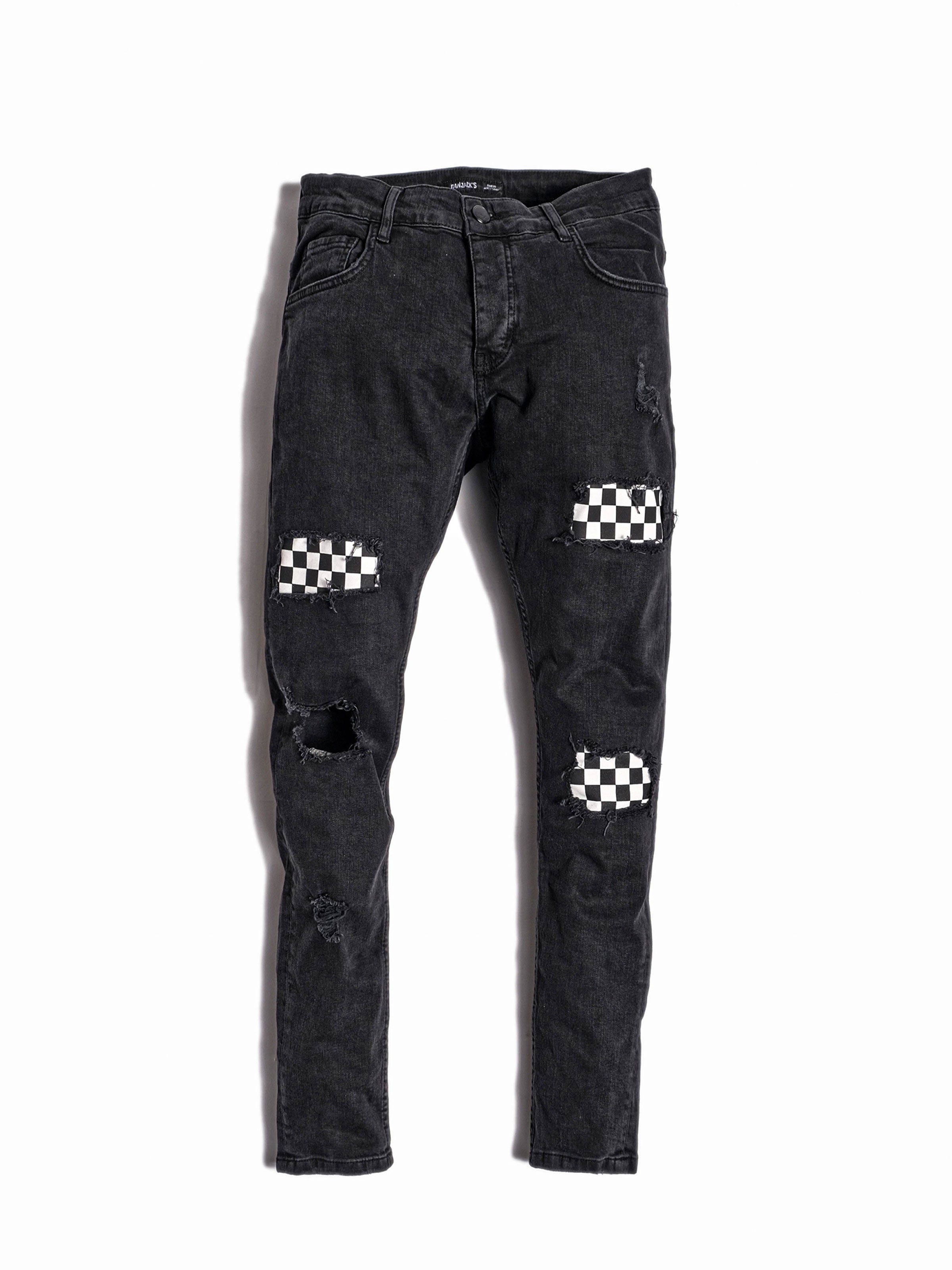 Black Chequered made from clean stretch denim fabric. It has rips and patches from the inside.