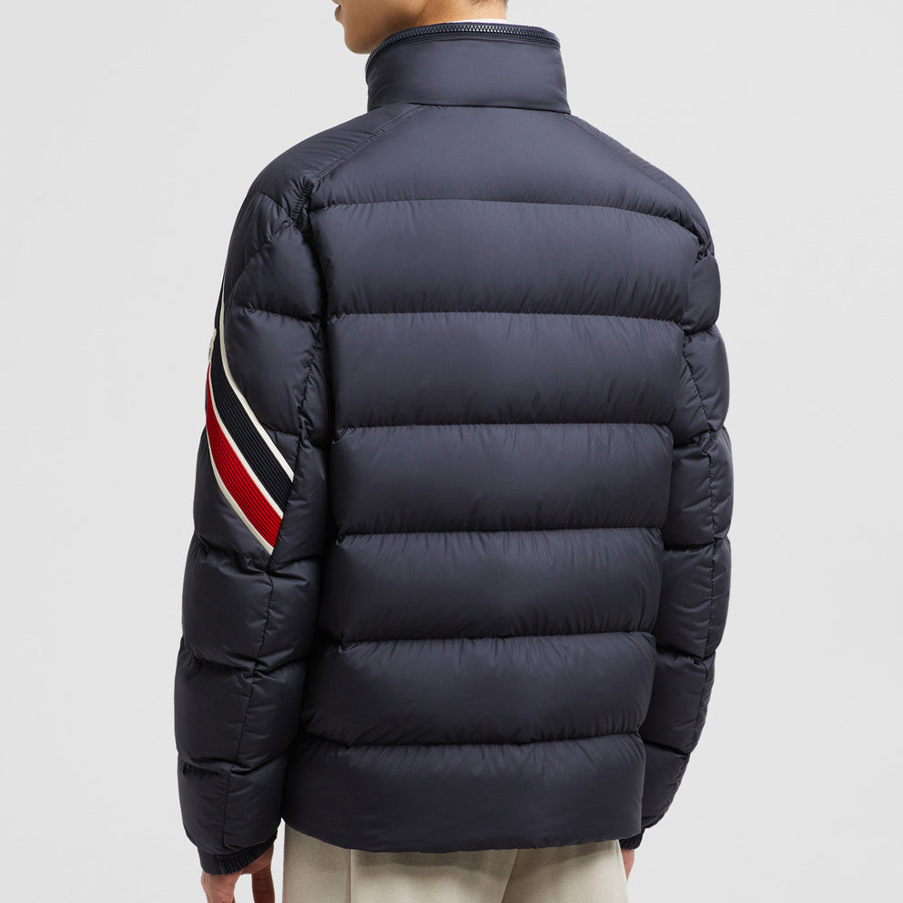 • Channeling Moncler's sporty spirit, the Solayan is a micro chic down jacket in a strong boxy shape. The short puffer is adorned by tricolour stripes on the sleeve, a seasonal adaptation of a brand signature. A practical pull-out hood finishes the design.