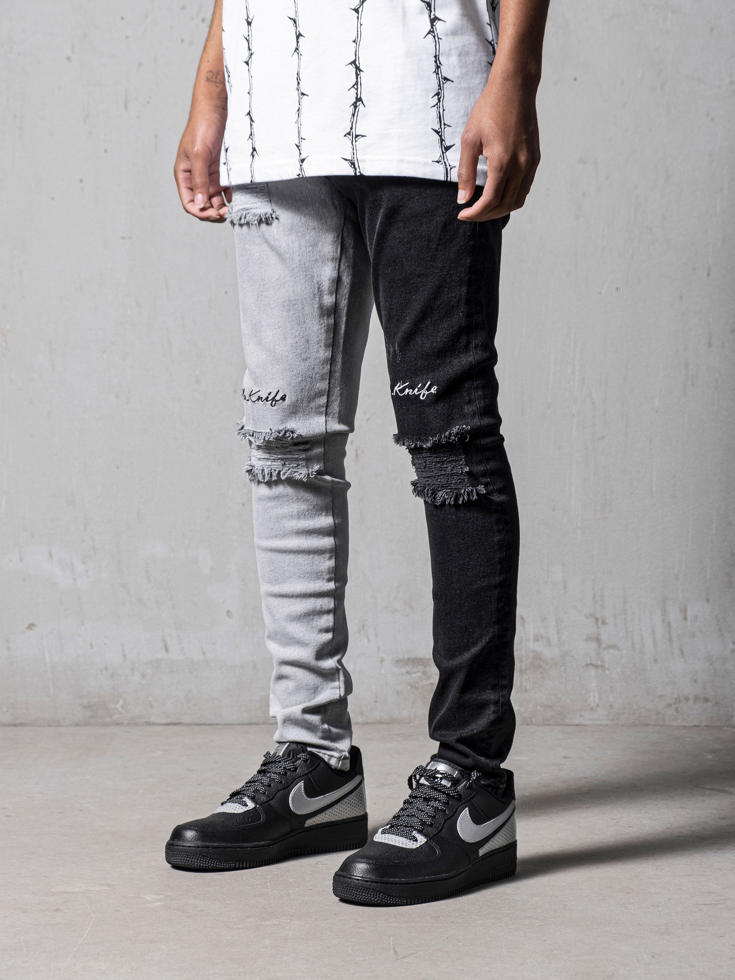 Mr. Knife Jeans are made from high-quality stretchy denim fabric. One side is grey, the other side is black on these jeans. It has rips on the knees and we embroidered Mr. Knife above the knee. It has a skinny fit and it gets skinnier through the ankles