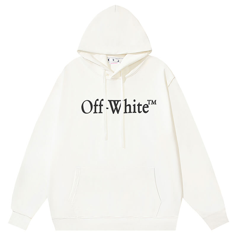 White long sleeves hoodie featuring off-White logo at front. Kangaroo pocket at front. White laces. Elasticized cuffs and hem