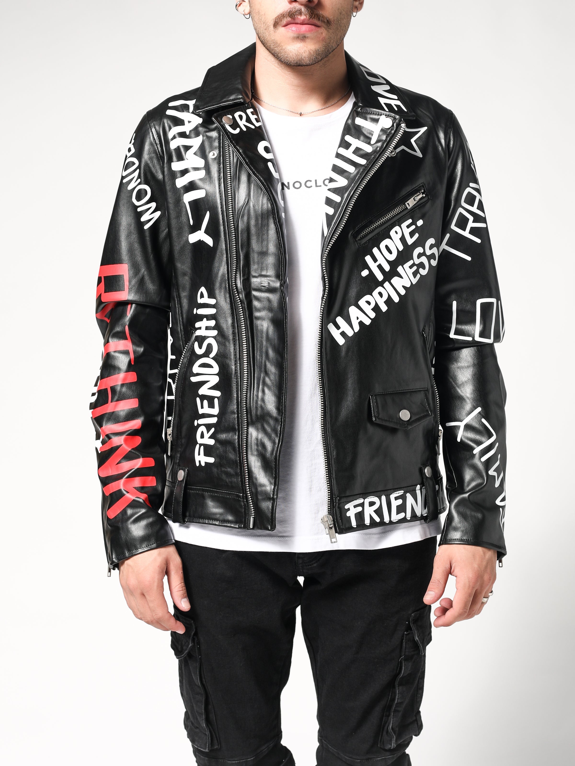 Thoughts Jacket is made from faux leather., It is not real leather. It is a slim fit jacket, with a v cut on the front featuring with multiple pockets and a blet.Wrtints on back and front